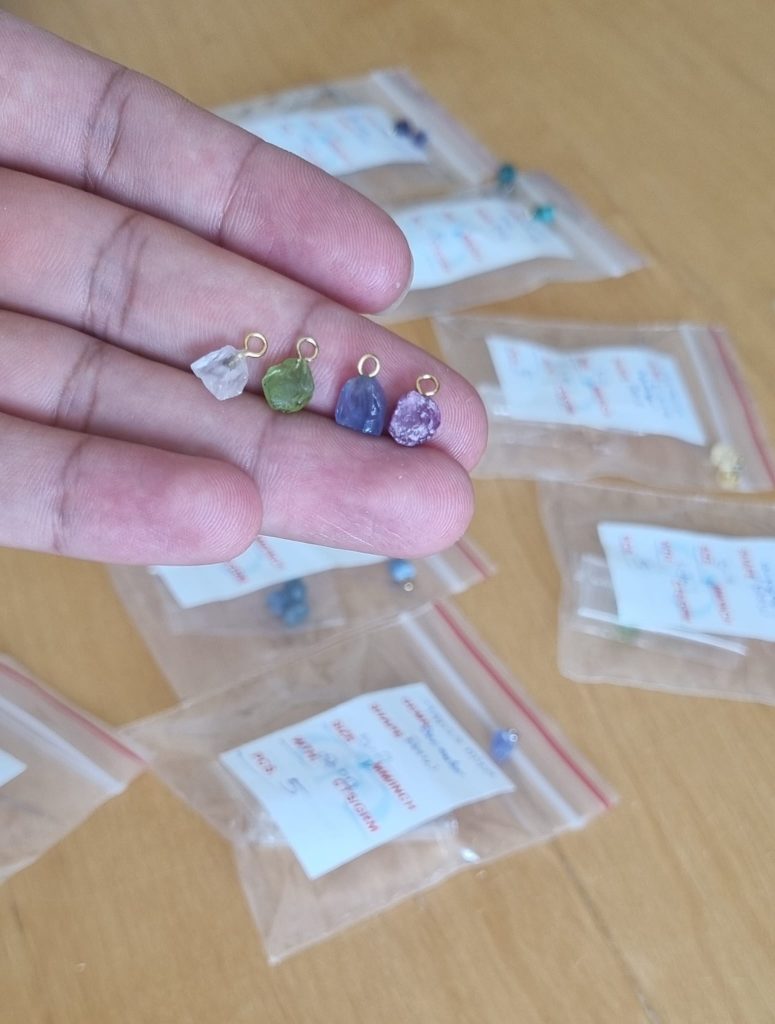 Hier zie je dat ik kleine natuurstenen hangertjes heb gemaakt om als geboortesteen aan een ketting te hangen 🙂