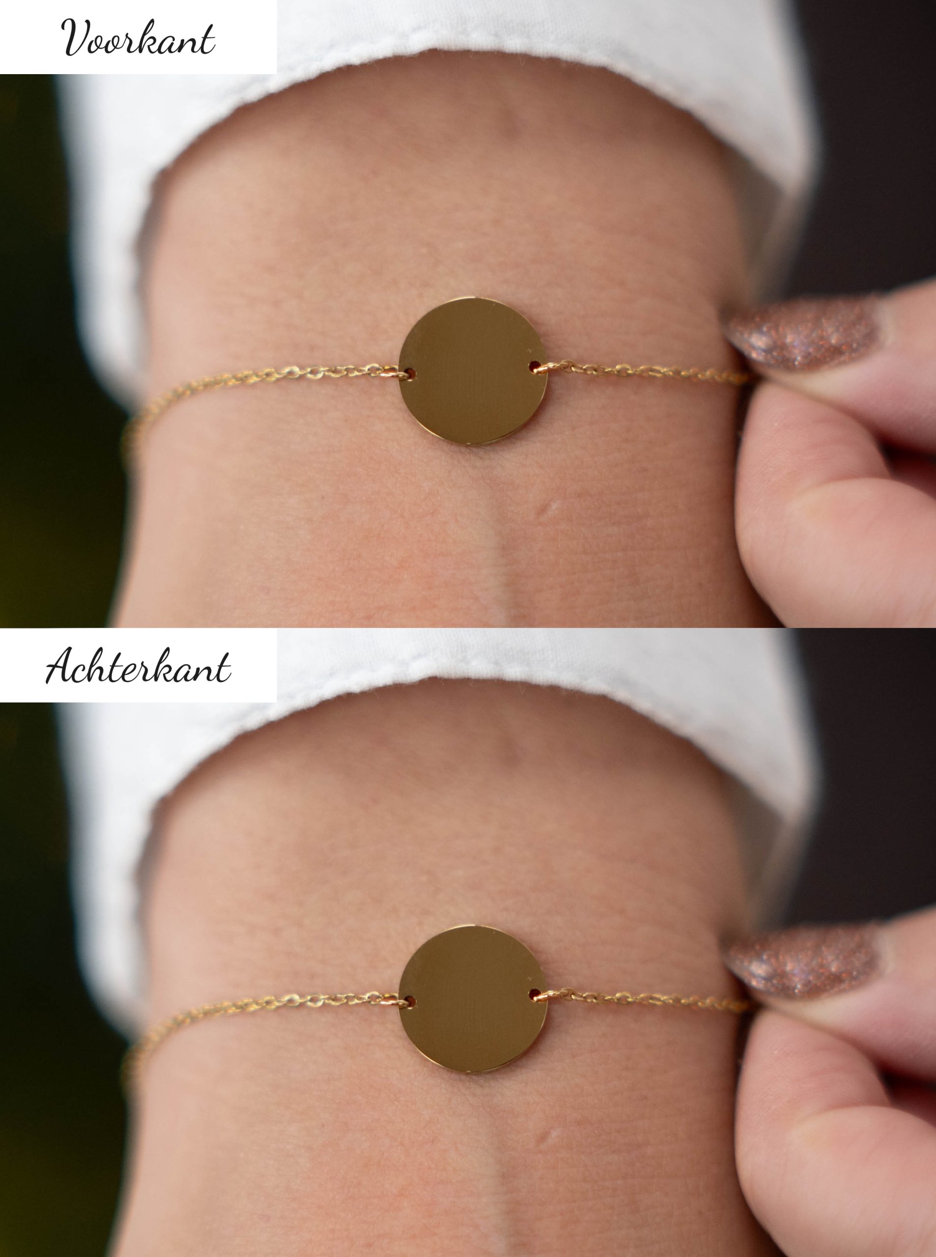 Onze Oro armband heeft een verfijnde schakel met een rond schijfje dat je kunt laten graveren met een naam, initialen of een bijzondere datum: een subtiel detail dat jouw verhaal zichtbaar maakt. Gemaakt van hoogwaardig 316L chirurgisch staal en verguld met 14 karaats goud voor een luxe uitstraling die lang mooi blijft. De tijdloze en minimalistische stijl maakt deze armband perfect om dagelijks te dragen en te combineren met andere sieraden.