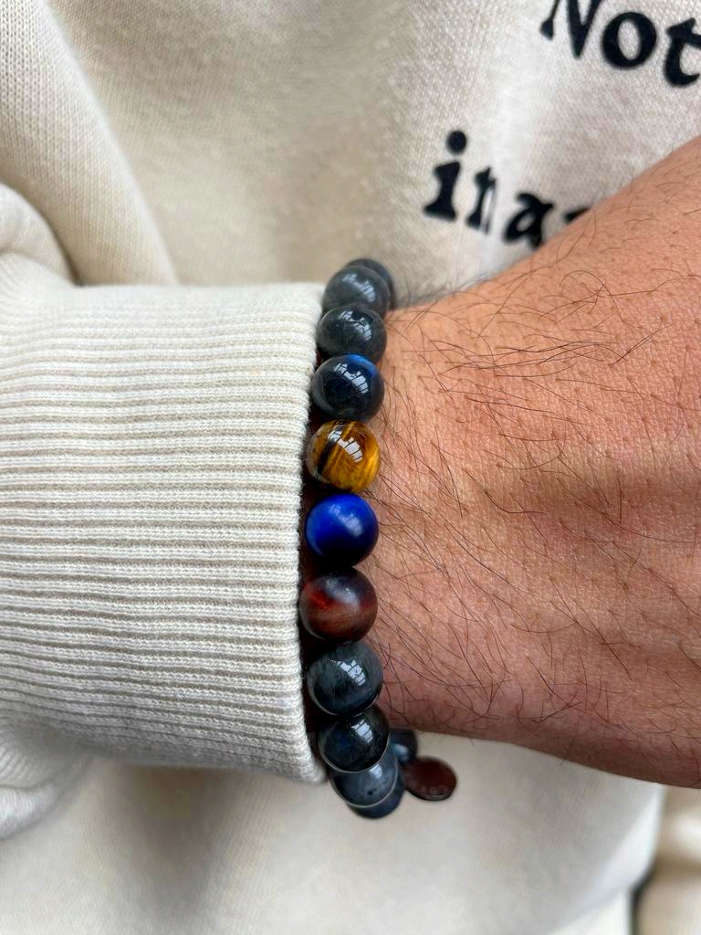- Materiaal steen: Labradoriet met drie tijgeroogkralen in de kleuren geel, blauw en rood